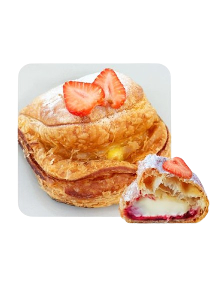 Flaky puff pastry filled with plentiful amounts of strawberry and custard fillings, dusted with powdered sugar