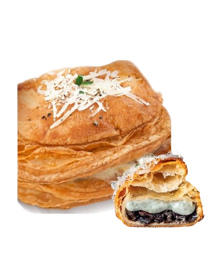 Flaky puff pastry filled with creamy truffle white sauce and sautéed mushroom chunks, topped with freshly grated cheese and fragrant lemon thyme garnish